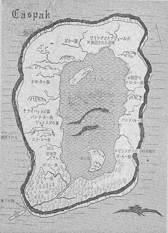 キャスパックの地図です! これにはバローズの書いた地図があって、地名はもちろん、東西南北に縮尺まで書いてあったりします。日本の文庫本ものはこれを真似たんだろうと思っていましたが、こうしてみるとかなり違いますね。してみると、文中の記述からおこしたのかな? バローズはまず地図を書いて、ストーリイに肉付けしていったはずなので、この地図は『時間に忘れられた国』を読み解くのに威力を発揮するはず!