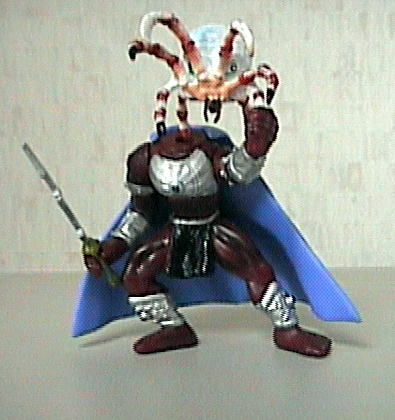 | 銃や剣などの小道具もついていたので、持たせてみました。作中ではみられないような勇ましい感じのデジャー・ソリス! 隠しすぎの感もありますが、やっぱり巨乳です(笑) | ほとんど蜘蛛人間の頭はちゃんとはずれます。片手には段平を持たせてみましたが、アングルがいまいちでしたね。 |