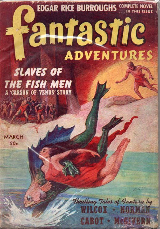 掲載作は 「魚人間と奴隷」Slaves of the Fish Men、のちに『金星と火の女神』Escape on Venus のタイトルで金星シリーズ第4巻としてまとめられた連作中編集の第1エピソードである「魚人間と奴隷」Slaves